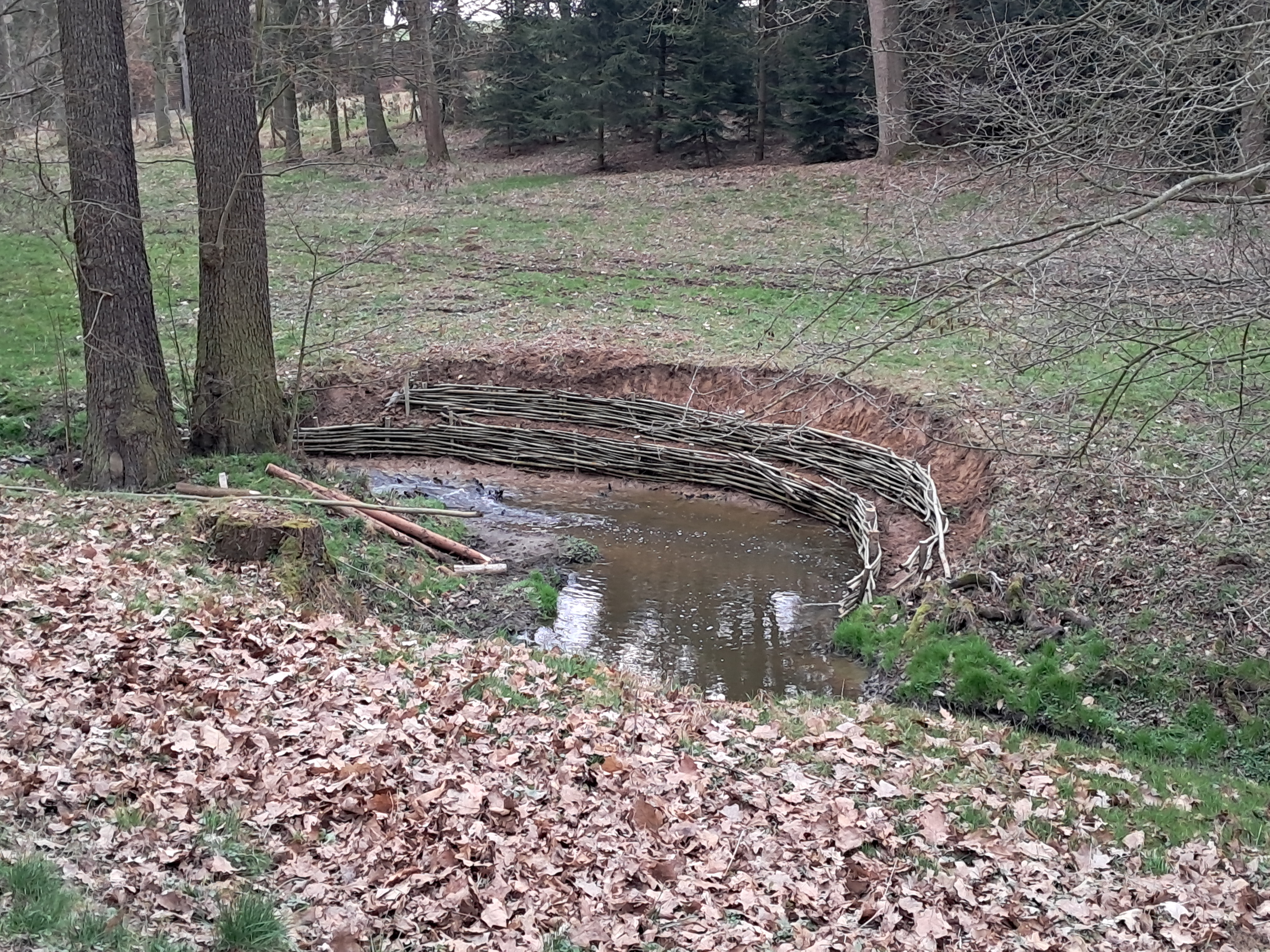 Odpolední část zahrnovala terénní prohlídku porostů a praktickou ukázku výstavby haťového plotu v meandru vodního toku v historickém parku, kde již dříve provedené haťování prokázalo odolnost i při opakovaných povodních. Na realizaci se aktivně podíleli pracovníci výzkumného ústavu, kteří ukázali práci s materiálem i techniku výpletu přímo v terénu.